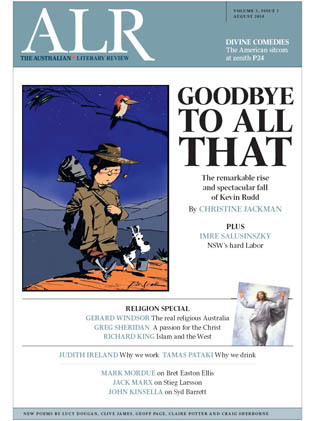 I’ve somewhat belatedly realised today is Australian Literary Review day. As usual selected highlights are available online, including the Pascal Award-winning Mark Mordue on Bret Easton Ellis’ Imperial Bedroom (which I’ve been meaning to try and compose some thoughts on myself) and a number of pieces linked to the election, of which the most significant is probably Christine Jackman’s piece on Annabel Crabb, David Marr and Nicholas Stuart’s books about Kevin Rudd. ALR Editor Stephen Romei’s Editorial is also online.